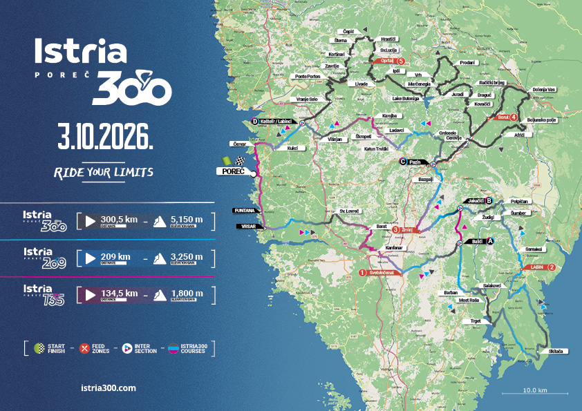 Es gibt drei Strecken (Istria300, Istria209 und Istria135). Entscheide während der Fahrt, welche Strecke du fahren möchtest. Du musst dich nicht bei der Anmeldung für eine bestimmte Strecke entscheiden.
